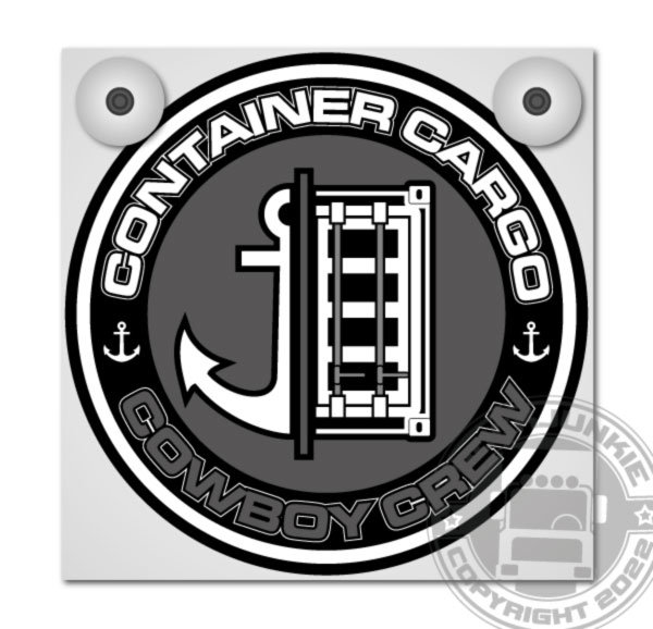 Graue Platte für Leuchtkasten mit zwei Befestigungspunkten und rundem 'Container Cargo Cowboy Crew' Logo mit Anker und Container.