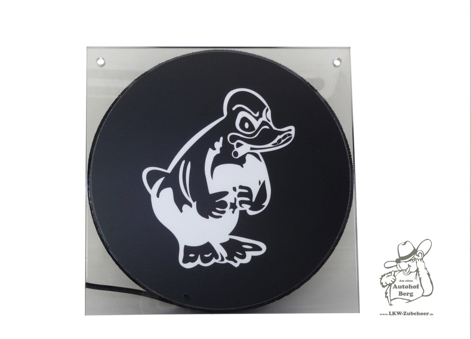 Quadratisches LKW-Schild mit beleuchteter, weißer böser Ente auf schwarzem Hintergrund. Mit USB-Anschluss.