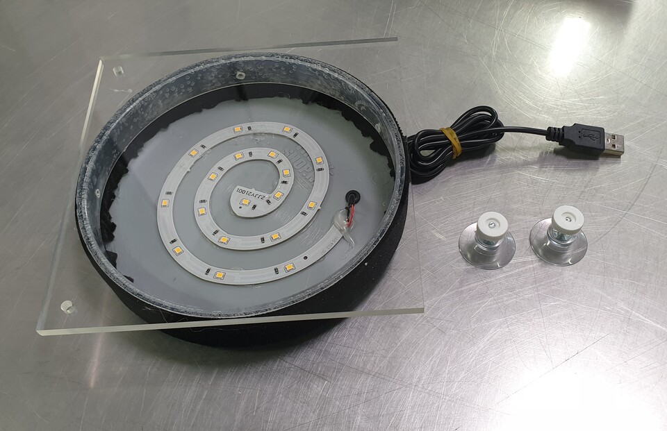 Rückansicht eines runden Leuchtkastens mit schwarzer Oberfläche auf transparenter Platte, dazu USB-Kabel und Saugnäpfe.
