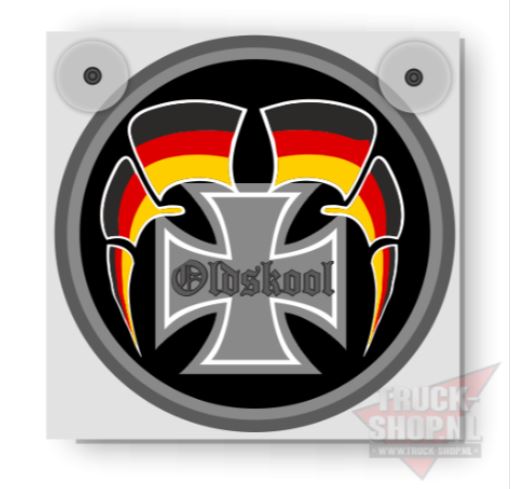 Quadratischer Leuchtkasten mit runder Grafik: Eisernes Kreuz, wehende Deutschlandfahnen und 'Oldskool' Schriftzug. Mit Saugern.