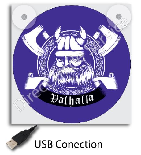Eckiger, blauer Leuchtkasten mit Wikingerkopf-Motiv, Äxten und "Valhalla" Schriftzug. Inklusive USB-Anschluss und Saugern.