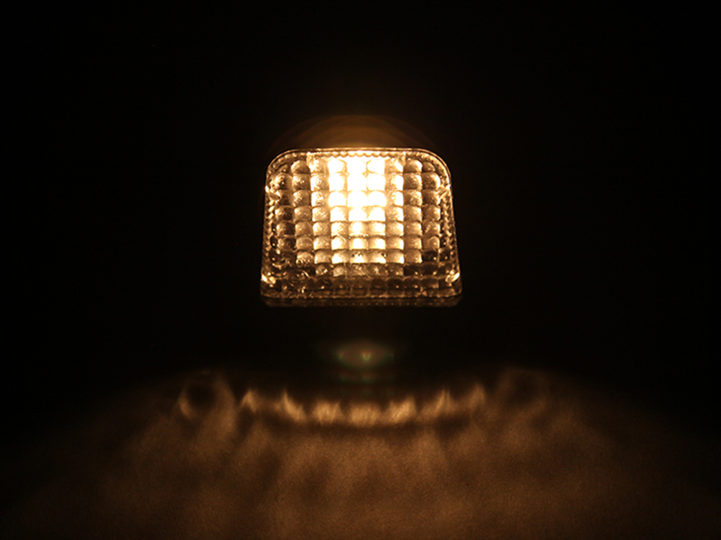 Schwarze Toplampe mit klarer, geriffelter Kunststofflinse und sichtbarer Birne.