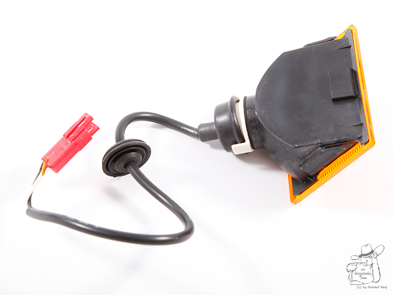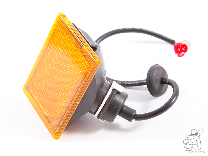 Rechteckige orangefarbene Lampe für Old School Sonnenblende mit schwarzem Kabel und rotem Anschluss.