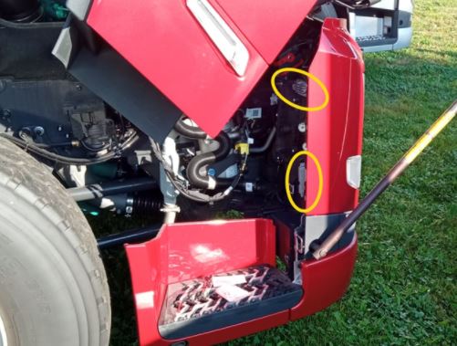 Roter Volvo FH5/FM5 LKW mit geöffneter Front, zeigt die Montagebereiche für den Ledson Tagfahrlicht-Umbausatz.