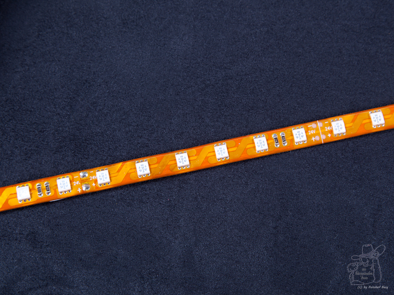 Ein orangefarbener LED-Streifen mit mehreren weißen LED-Komponenten und 24V-Aufdruck auf dunklem Hintergrund.