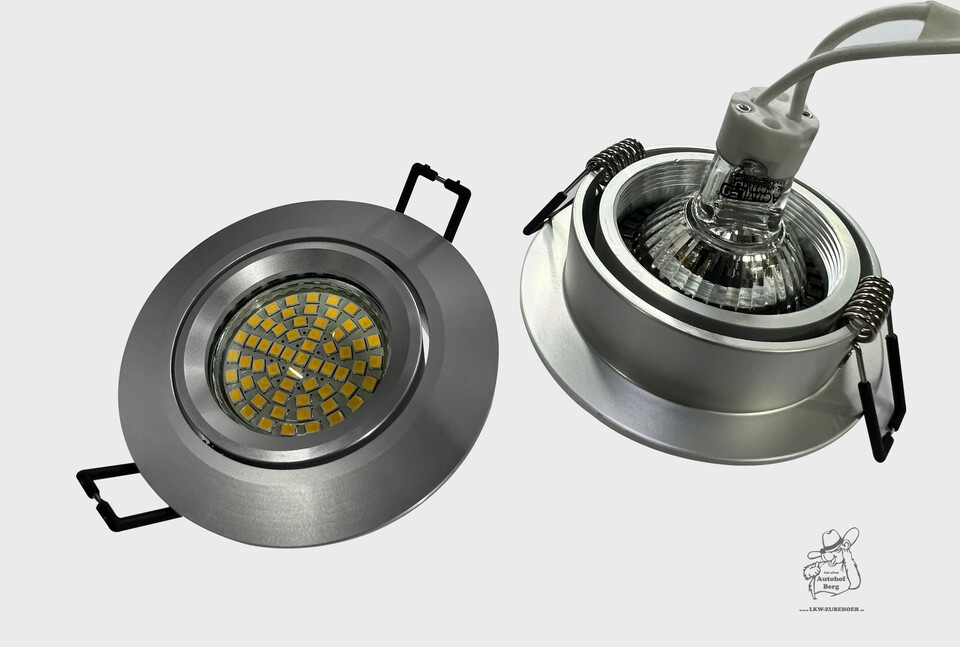 Zwei silberne Innenraumleuchten. Eine mit gelben LEDs, die andere mit klarer Glühbirne.