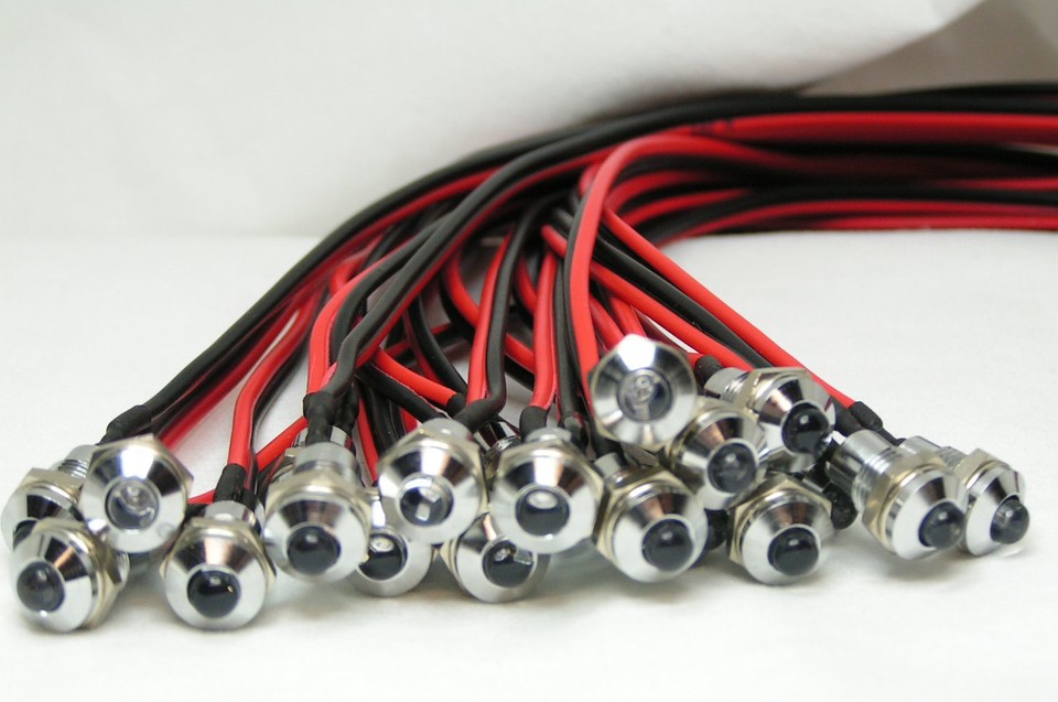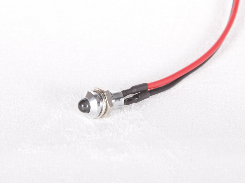 Schraubbare LED mit silbernem Metallgehäuse, dunkler Linse und roten, schwarzen Anschlusskabeln.