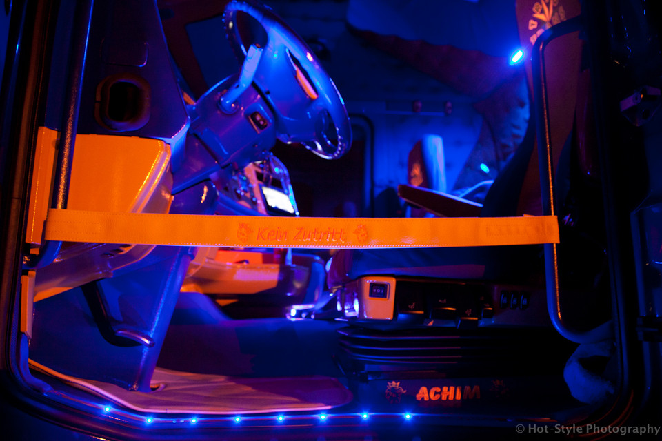 Blauer LKW-Innenraum mit blauen LED-Leuchtmitteln und MAN-Einstiegsleiste.