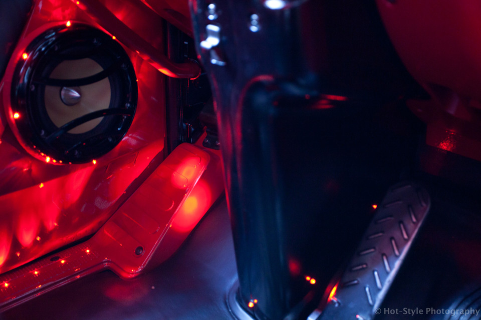 Rote LED-Beleuchtung im LKW-Innenraum, an Türverkleidung und Bodenbereich. Ein Lautsprecher ist ebenfalls beleuchtet.