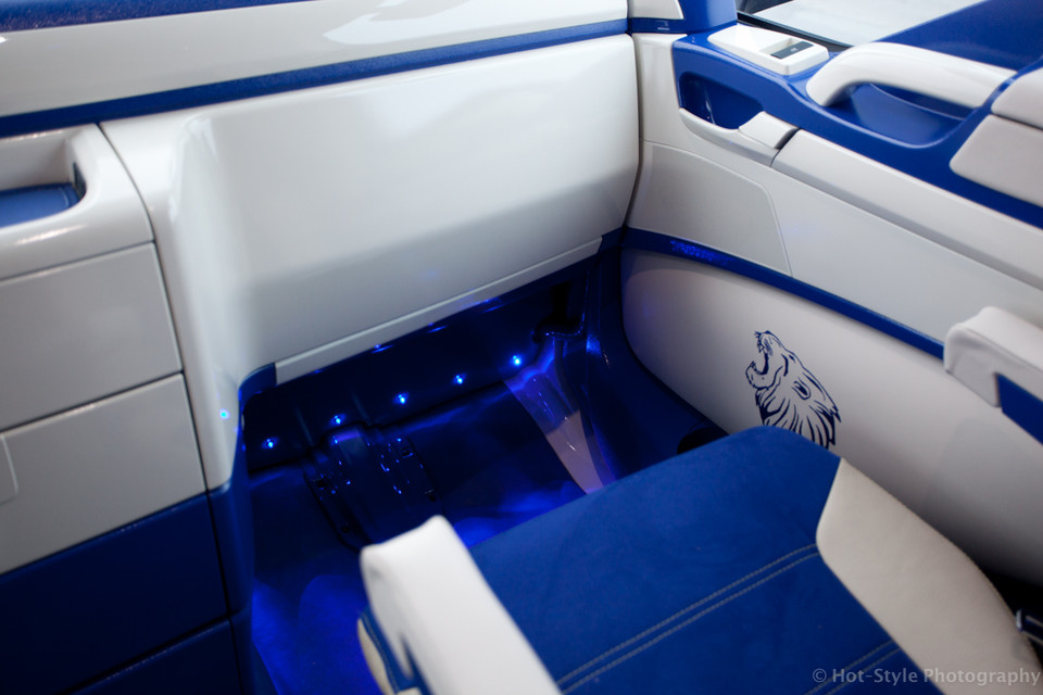 LKW-Kabine mit installierten blauen LED-Leuchten im Fußraum. Weiß-blaue Innenausstattung.