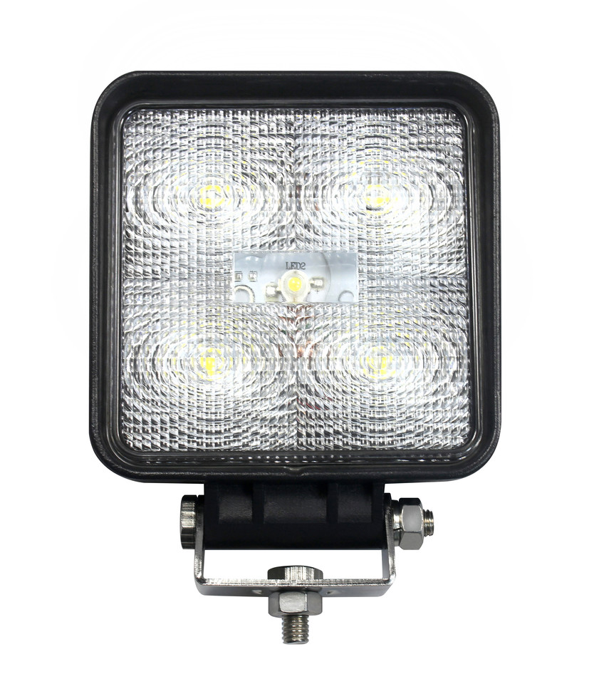 Quadratische LED-Arbeitslampe mit schwarzem Gehäuse, klarer Linse und Edelstahl-Montagehalterung.