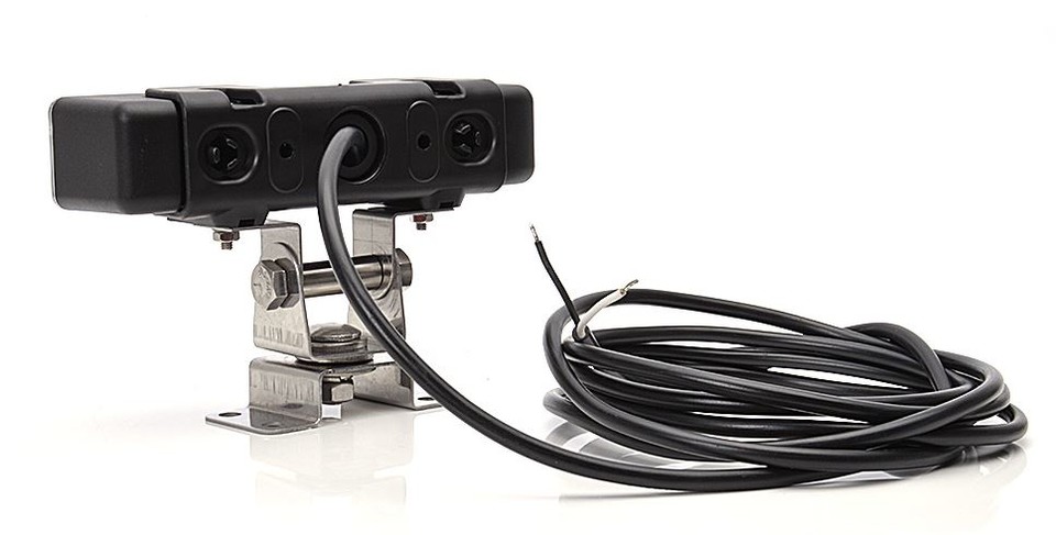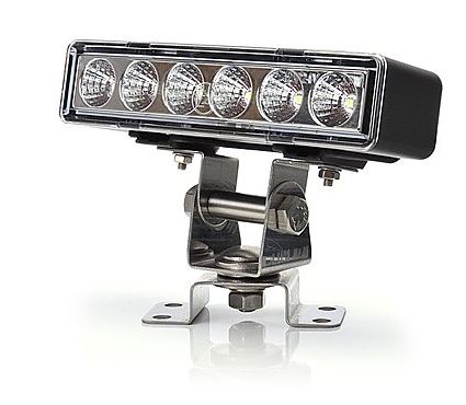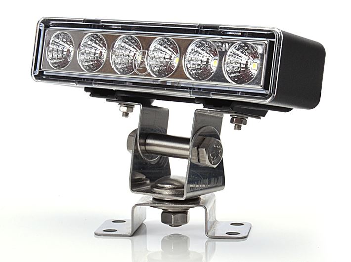 Ein schwarzer LED Arbeitsscheinwerfer mit klarer Abdeckung und mehreren LEDs, montiert auf einer robusten Edelstahlhalterung.