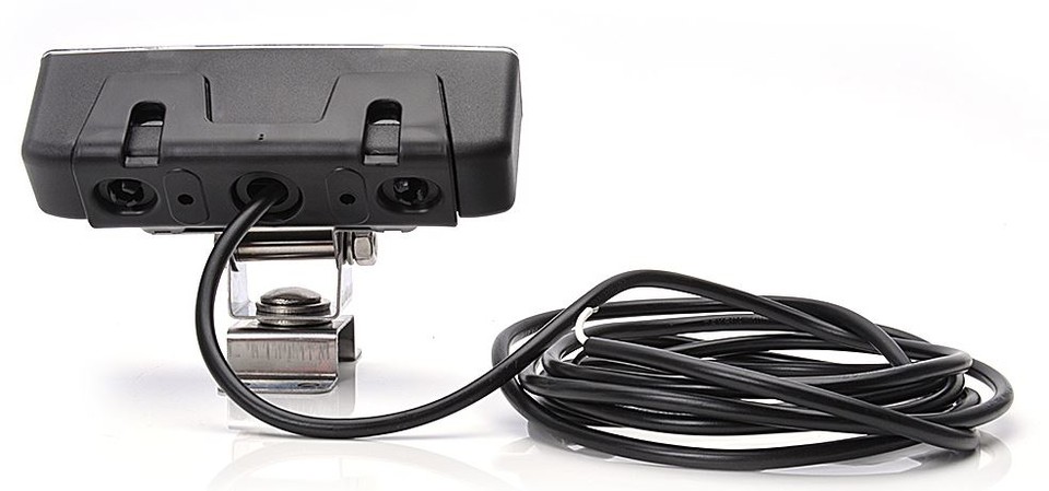 Ein schwarzer LED Arbeitsscheinwerfer mit silberner Halterung und langem, schwarzem Anschlusskabel.