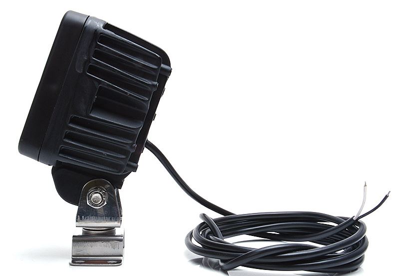 Quadratischer LED Arbeitsscheinwerfer mit schwarzem Aluminiumgehäuse, LEDs, Montagefuß und Anschlusskabel.