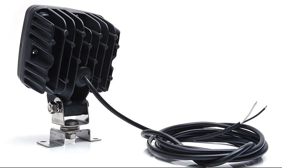 Schwarzer LED Arbeitsscheinwerfer aus Aluminium mit Kühlrippen, silberner Halterung und schwarzem Kabel.
