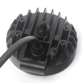 Rückseite einer runden, schwarzen LED Arbeitsleuchte aus Aluminium mit Kühlrippen und angeschlossenem Kabel.