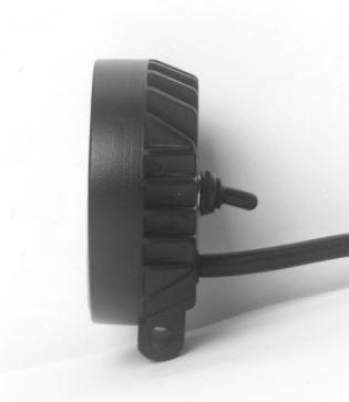 Seitenansicht einer runden, schwarzen LED Arbeitsleuchte aus Aluminium mit Kühlrippen und Kabelanschluss.