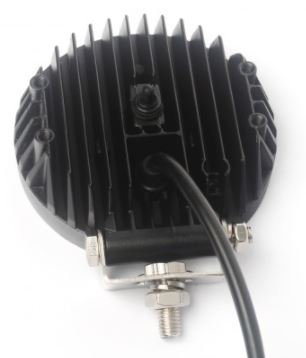 Runde LED Arbeitsleuchte aus schwarzem Aluminium, Rückseite mit Kühlrippen, Montagebügel und Kabelanschluss.