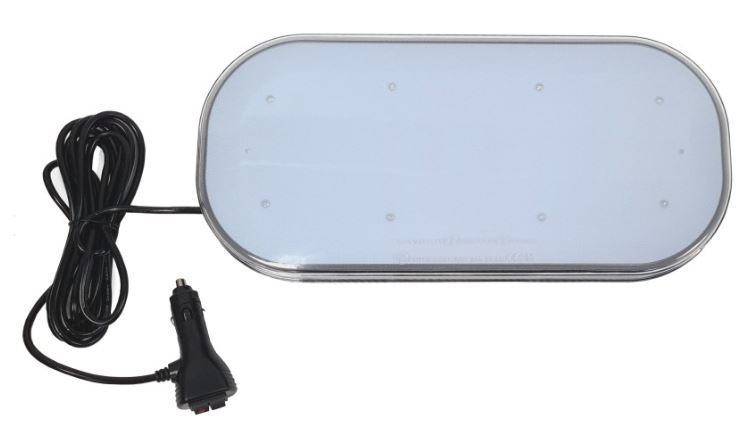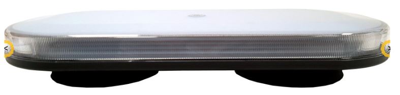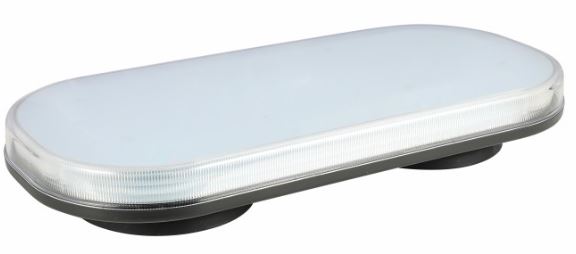 Ovaler Warnbalken mit klarer PC-Linse und dunklem Gehäuse, magnetisch montiert.