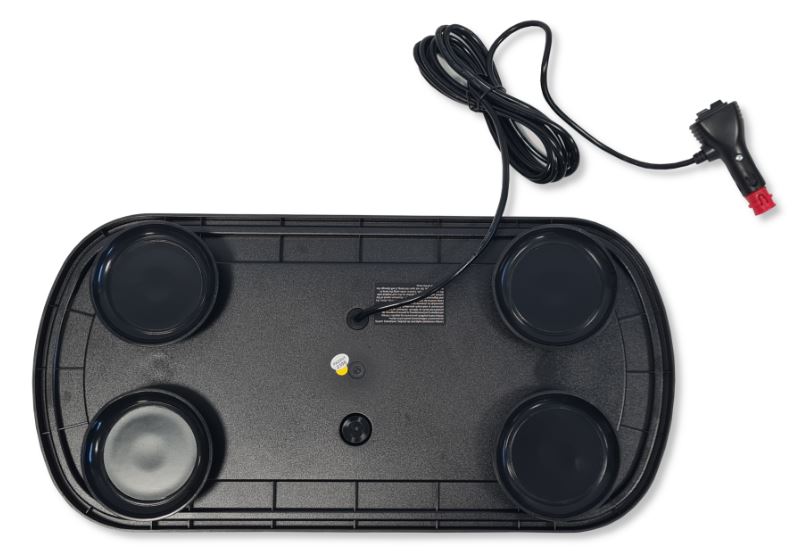 Unterseite eines schwarzen Warnbalkens aus Kunststoff mit Magnetbefestigung und Kabel mit Stecker.