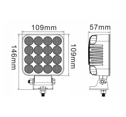 Quadratische LED Arbeitsleuchte mit dunklem Gehäuse, klarem Glas und mehreren gelblich-weißen LEDs. Inklusive Montagehalterung.