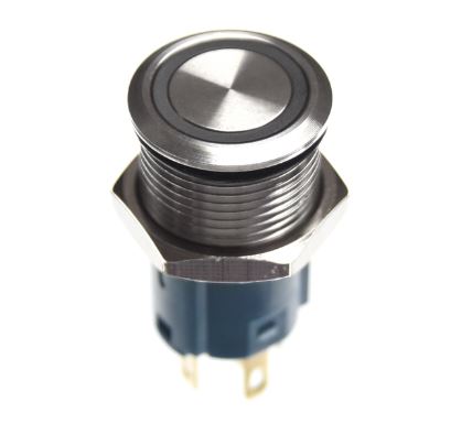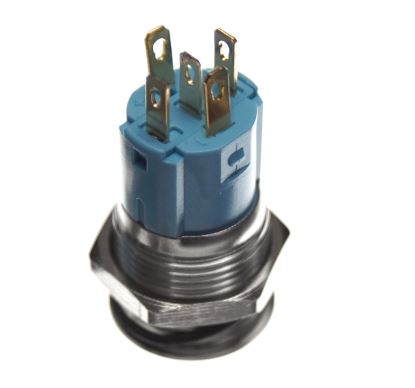 Edelstahl-Druckschalter LAS3 mit runder Front, blauer Anschlussbasis und mehreren goldenen Kontakten.