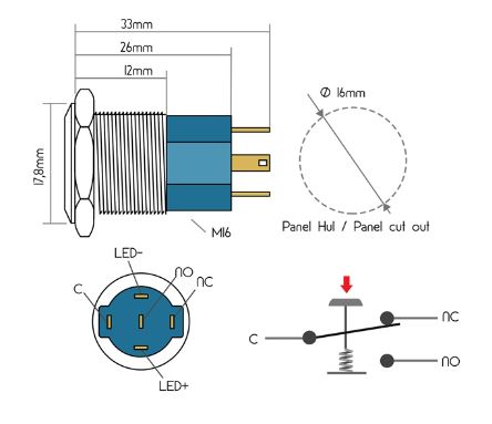 Technische Zeichnungen des LAS3-Edelstahl-Schalters. Zeigt Ansichten, den 16mm Lochausschnitt und den Schaltplan.