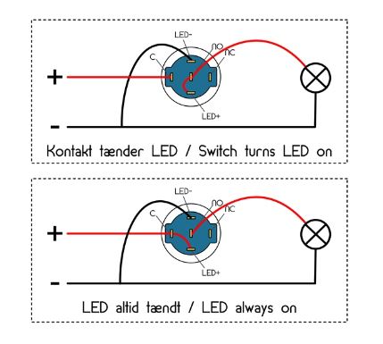 Die Anzeigeleuchte kann auf verschiedene Arten angeschlossen werden, beispielsweise so, dass sie immer leuchtet oder nur, wenn die Taste gedrückt wird.