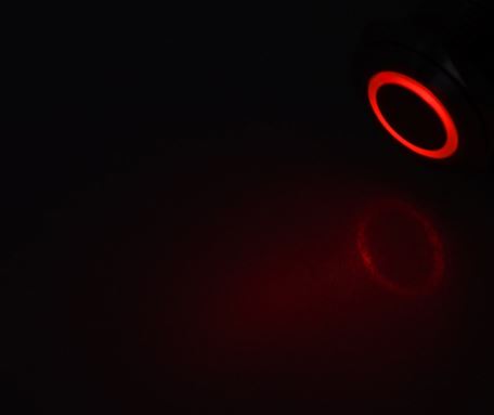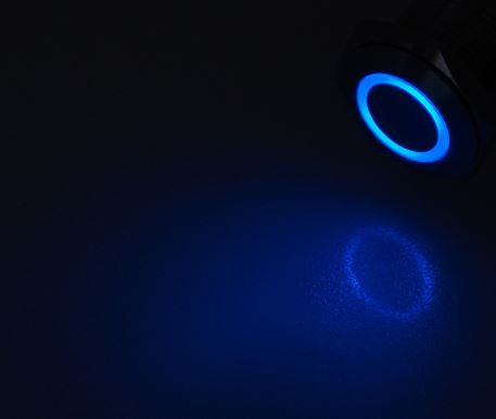 Edelstahl LAS3-Schalter mit silbernem Gehäuse, schwarzem LED-Ring und blauer Unterseite.