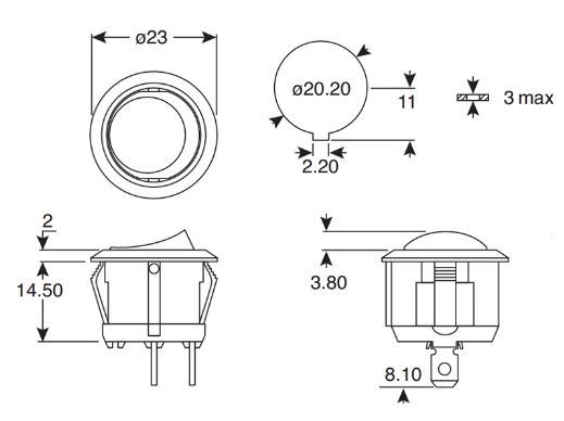 Der Schalter passt in ein Loch mit einem Durchmesser von 21 mm. Die Plattendicke darf nur 0,7-3 mm betragen. Auf der Unterseite befinden sich 2 Kabelschuhstifte mit den Maßen 4,75 x 0,8mm.