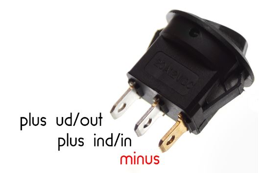 Runder schwarzer Kippschalter mit Beleuchtung, Rückseite mit Anschlüssen.