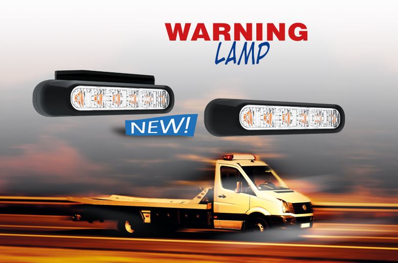 Orange LED Blitzer Warnleuchte mit schwarzem Gehäuse und mehreren orangefarbenen LEDs über einem fahrenden weißen LKW.