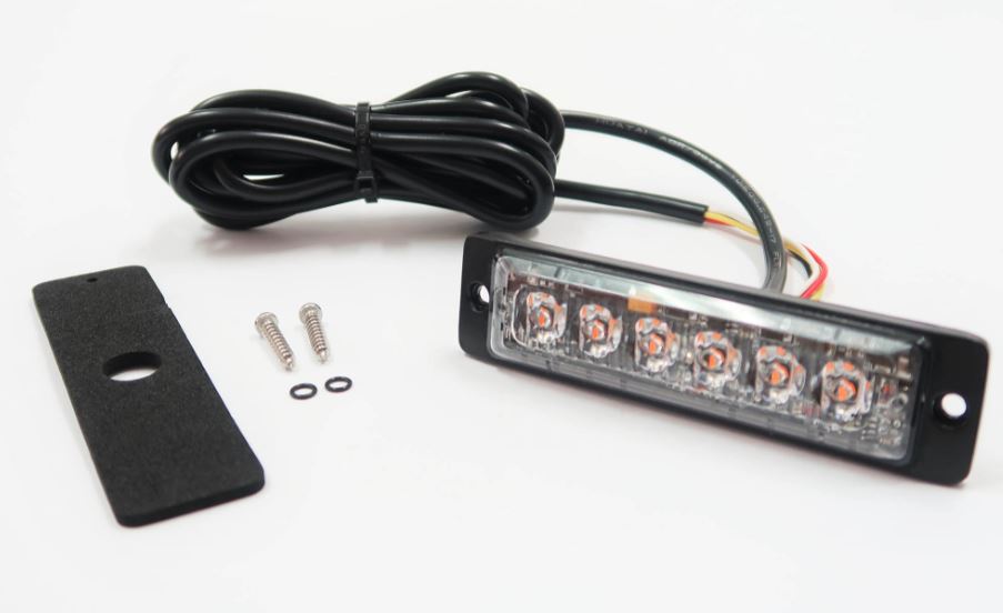 Schlanker LED-Blitzer mit orangefarbenen LEDs, schwarzem Gehäuse, Kabel und Montagematerial.