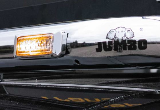 Leuchtender, oranger Jumbo Blitzer mit Chromrahmen. Das Jumbo-Logo mit Elefant spiegelt sich in der Chromfläche.