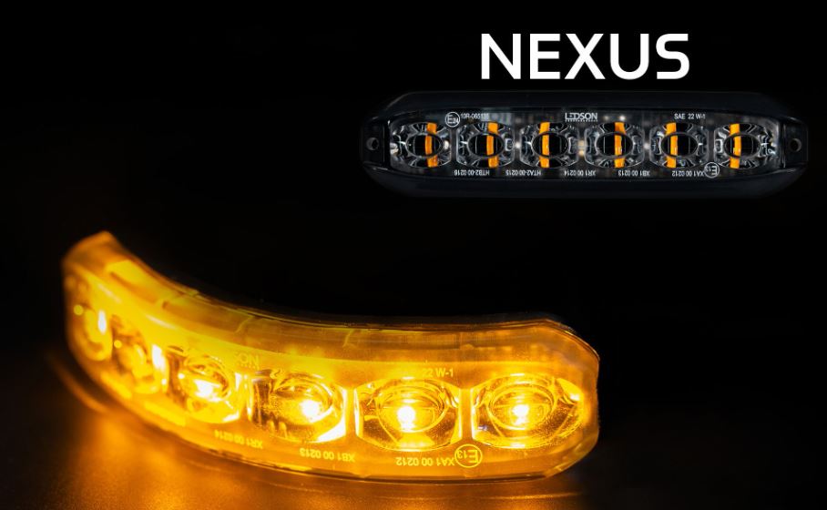 Zwei Ledson Nexus LED-Warnleuchten: eine gerade, dunkle und eine gebogene, leuchtend orange.