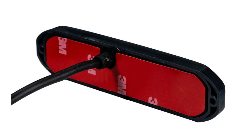 Rückseite einer schwarzen LED-Warnleuchte mit roten 3M-Klebestreifen und Kabel.