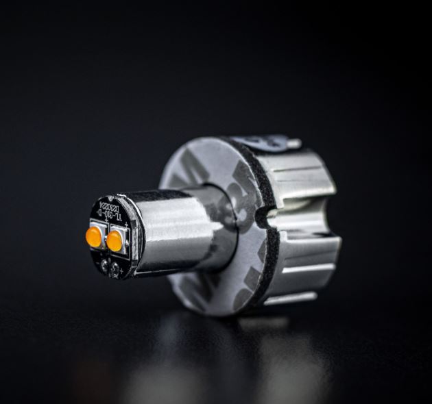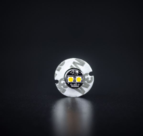 Nahaufnahme des LED-Moduls für den Strands Mini Blitzer mit bernsteinfarbenen LEDs und weißer Klebefläche.