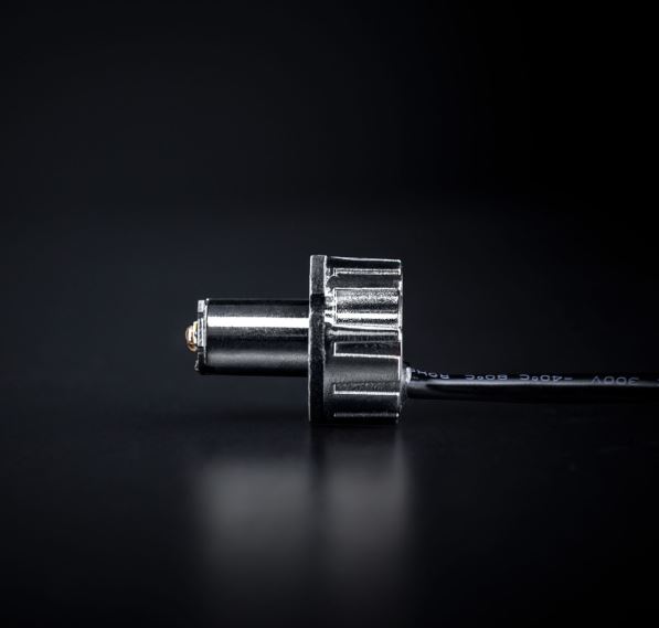 Strands Mini Blitzer LED mit silbernem Gehäuse, schwarzem Kabel und bernsteinfarbener LED.