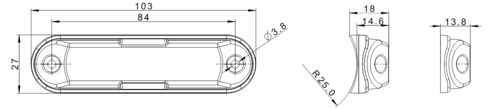 Technische Zeichnung der LED-Warnleuchte, die ihre Form und Befestigungspunkte zeigt.