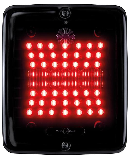 Schwarze, eckige Heckleuchte mit dunkler Linse und leuchtenden roten LEDs. Oben steht 'TOP'.