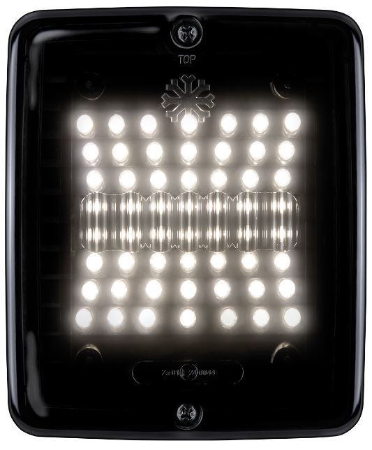 Eckige schwarze Heckleuchte mit dunkler Linse und vielen kleinen LED-Punkten im Inneren. Das Wort 'TOP' ist oben sichtbar.