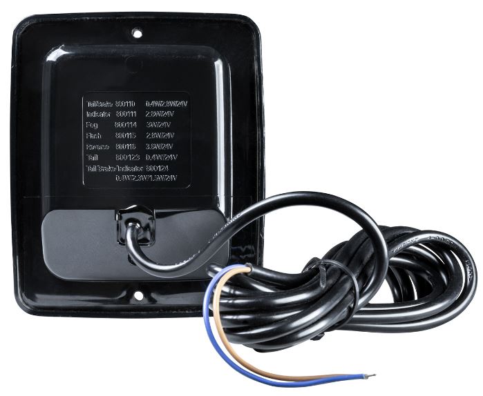 Rückseite der schwarzen, eckigen Heckleuchte mit angeschlossenem Kabel und farbigen Leitungen.