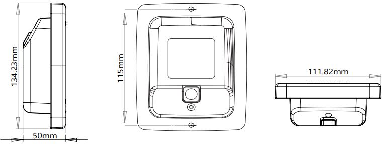 Drei technische Ansichten der eckigen DARK Knight Heckleuchte: Seite, Front, Oben.