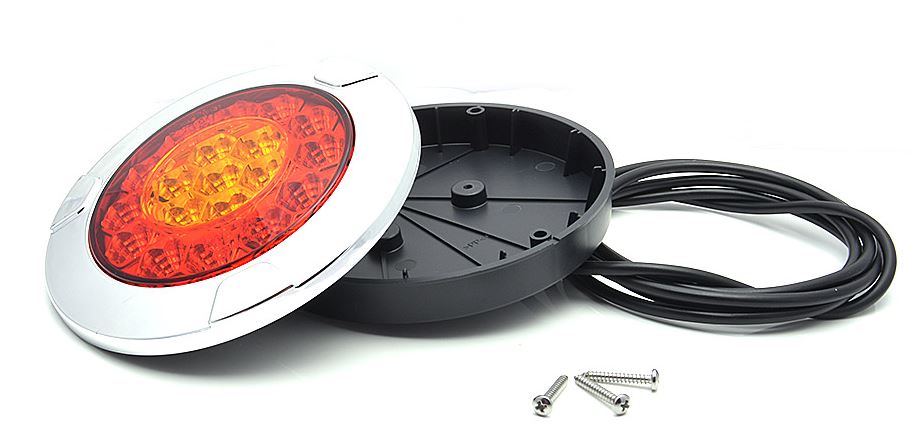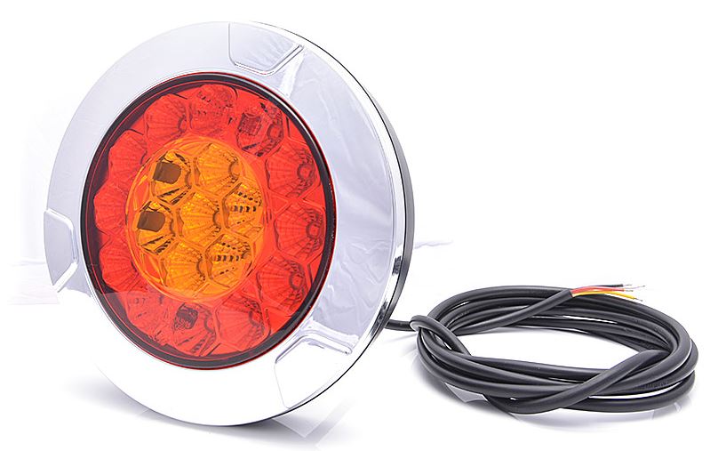 Runde LKW-Heckleuchte im Wabendesign mit rotem und bernsteinfarbenem Licht, Chromrahmen und Anschlusskabel.