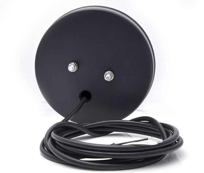 Runde, schwarze Heckleuchte von hinten mit Befestigungsschrauben und Kabel.