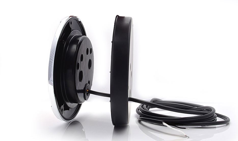 Runde schwarze LKW-Heckleuchte mit Chromrand und Kabel, Seitenansicht auf weißem Grund.