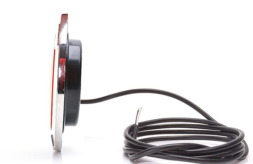 Rote LKW-Heckleuchte mit Chromrand und schwarzem Gehäuse, seitliche Ansicht mit Kabel.