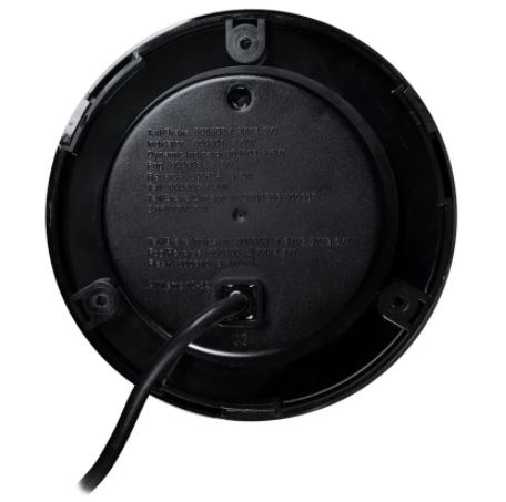 Seitliche Ansicht einer runden, schwarzen Polycarbonat Heckleuchte mit angeschlossenem Kabel auf weißem Hintergrund.